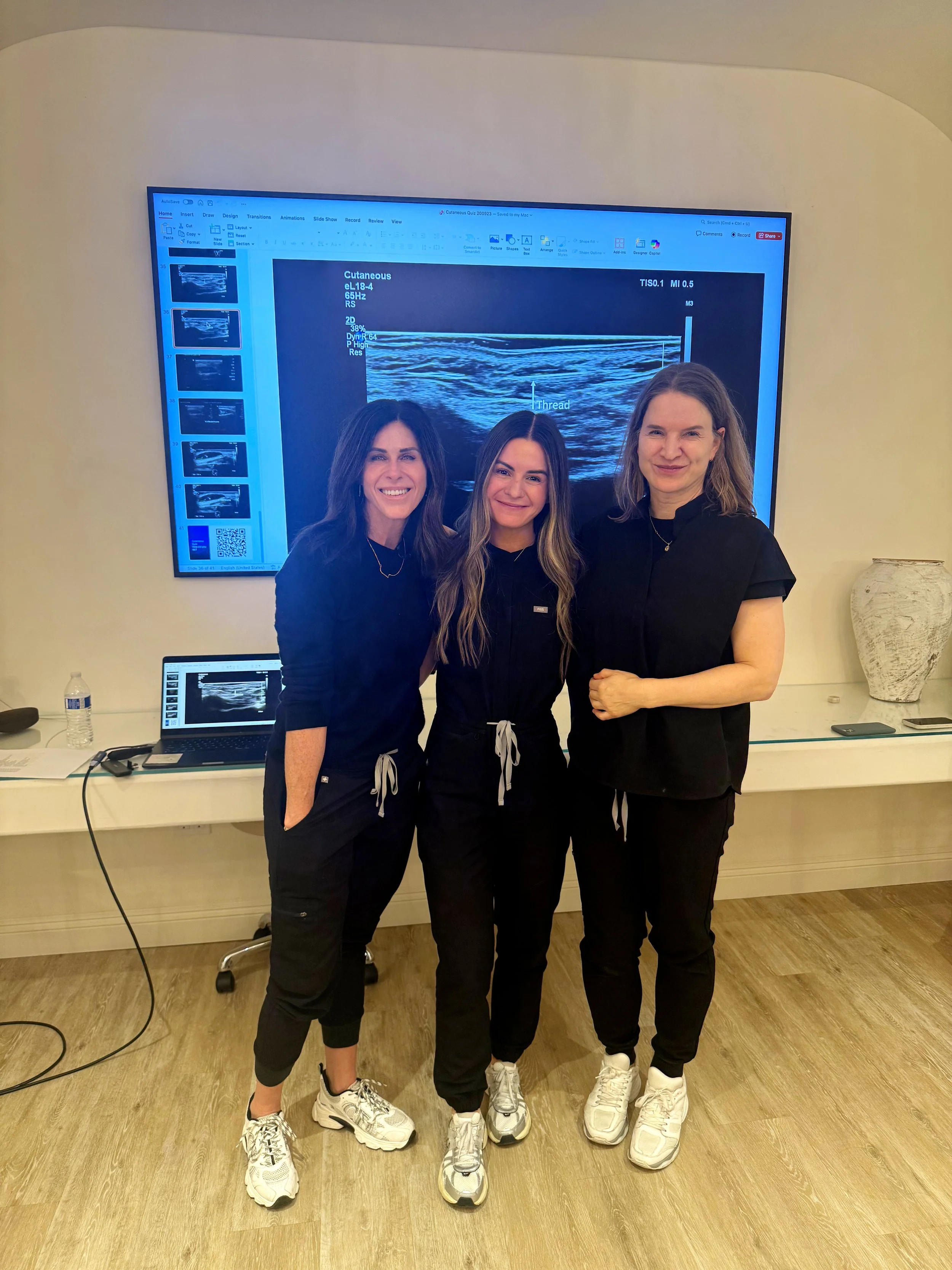 I completed hands-on ultrasound guided injection training in Manhattan Beach, California at the N2 Aesthetics training center, learning from industry leaders Nicola Lowrey and Leonie Shelke. This intensive training focused on facial anatomy, vascular mapping, filler assessment and complication management using real-time ultrasound imaging.